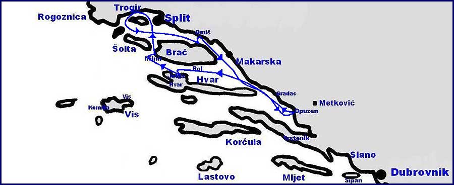 Trogir - Pučišća (Brač) - Omiš - Zaostrog - Metković (Opuzen) - Ausflug: Mostar, Medjugorje - Gradac - Jelsa (Vrboska) - Bol (Milna) - Trogir